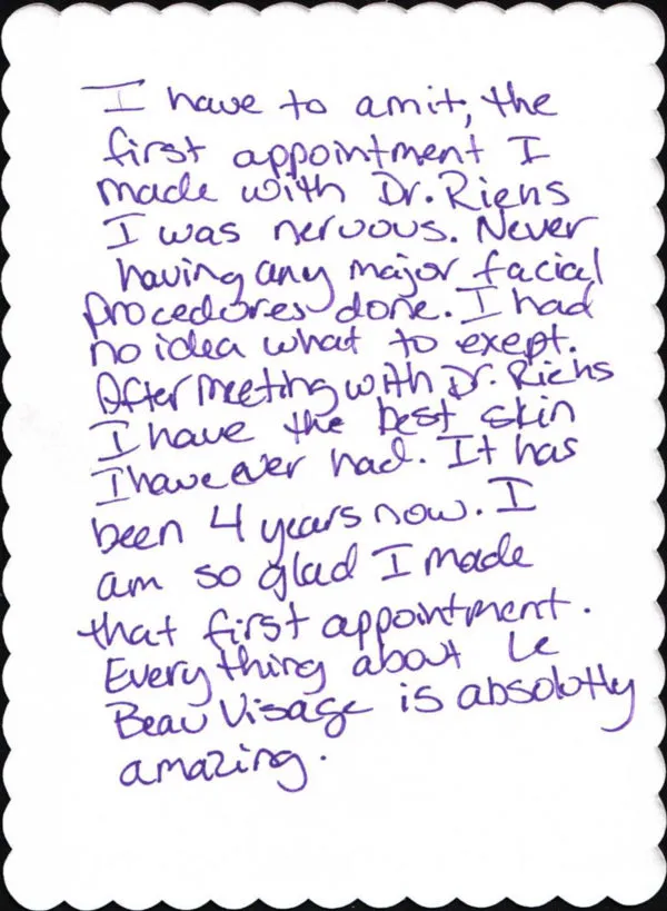 “I have to admit, the first appointment I made with Dr. Riehs, I was so nervous. Never having had any major facial procedures done, I had no idea what to expect.” She states that she expected to be fussed over and was concerned that her flaws may be escalated in an attempt to have more services. But, the exact opposite happened.