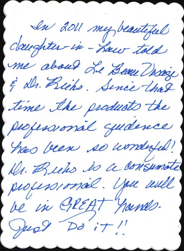 Nancy said that she wasn’t happy with her appearance and was losing confidence before coming to Dr. Riehs’ office. It was word of mouth that introduced Nancy to the practice. She says her daughter- in -law, Angela, who sung high praises for Dr. Riehs and the team at Le Beau Visage Aesthetic Center, told her of the practice. Nancy shared a curiosity and excitement about seeing the results of Angela’s treatments and elected to visit the practice herself. She considered the benefits and prices of multiple procedures but did not want to be “overdone.” Ultimately, she elected to undergo treatments using injectable fillers.